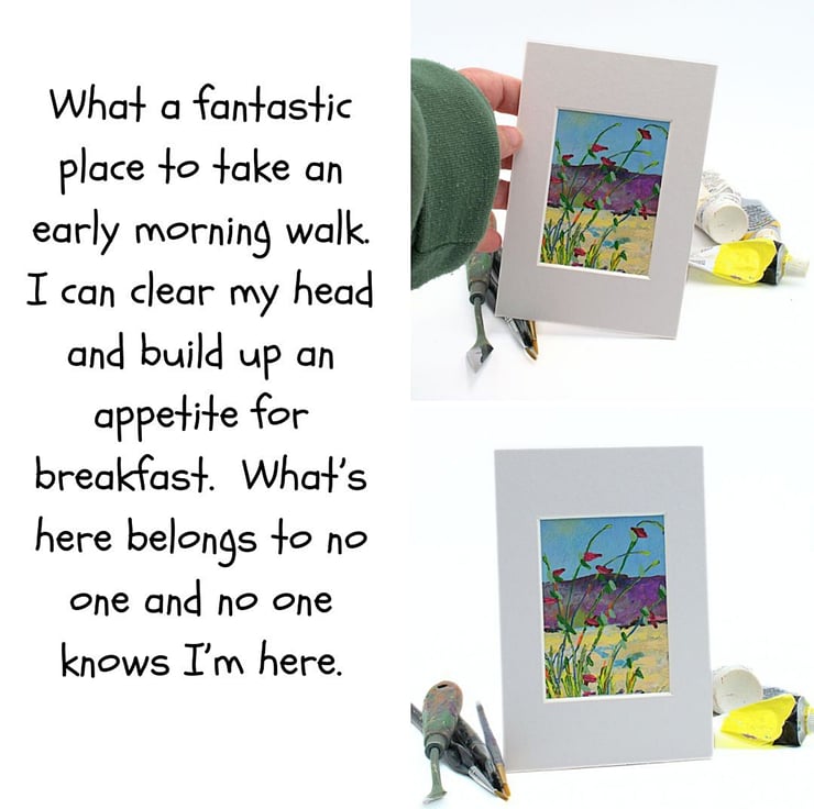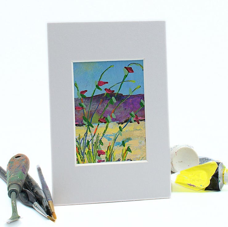 This is a small mounted painting in acrylic. The sky is a clear blue and the hills in the distance are bathed in bright sunshine. the foreground is dominated by tall red wildflowers, reaching up towards the light. I have used a combination of brushes and old pins to apply thick layers of acrylic paint on to the sealed paper. This will make an ideal letterbox gift.