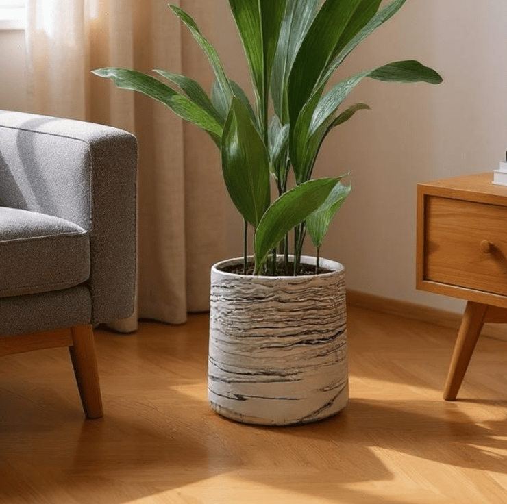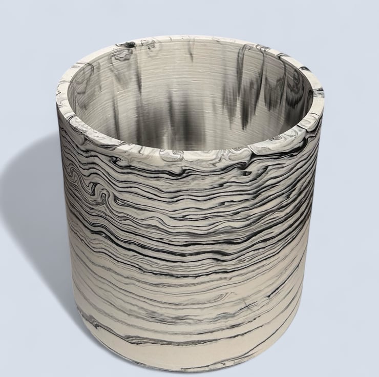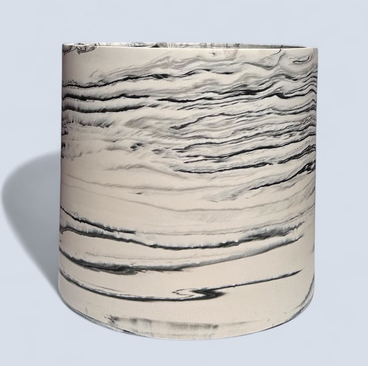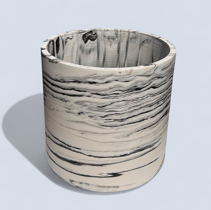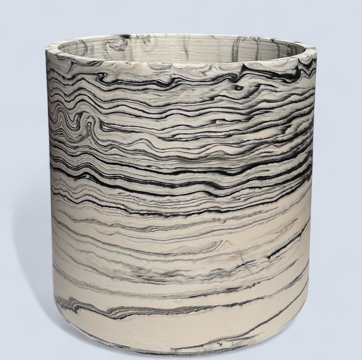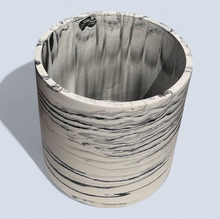 This handmade, large round plant pot features a unique black marbled pattern on a white background. Crafted from Cassini, it has a smooth, durable external finish that resembles marble and is water—and weather-resistant. Its neutral colours allow it to fit seamlessly into most interior design aesthetics, making it an ideal gift or a wonderful treat for yourself.