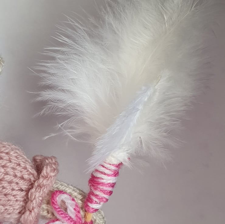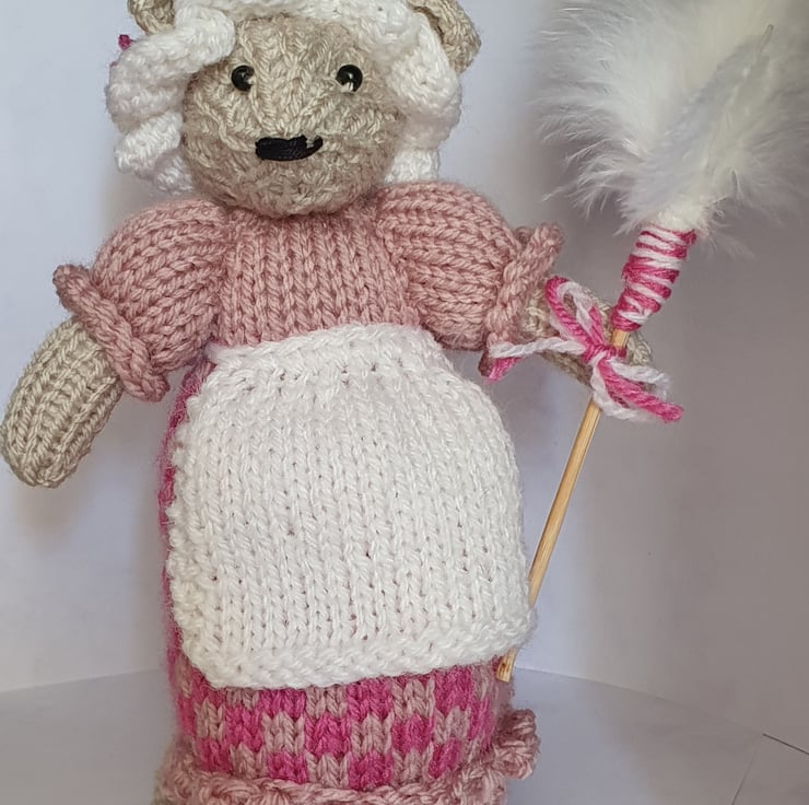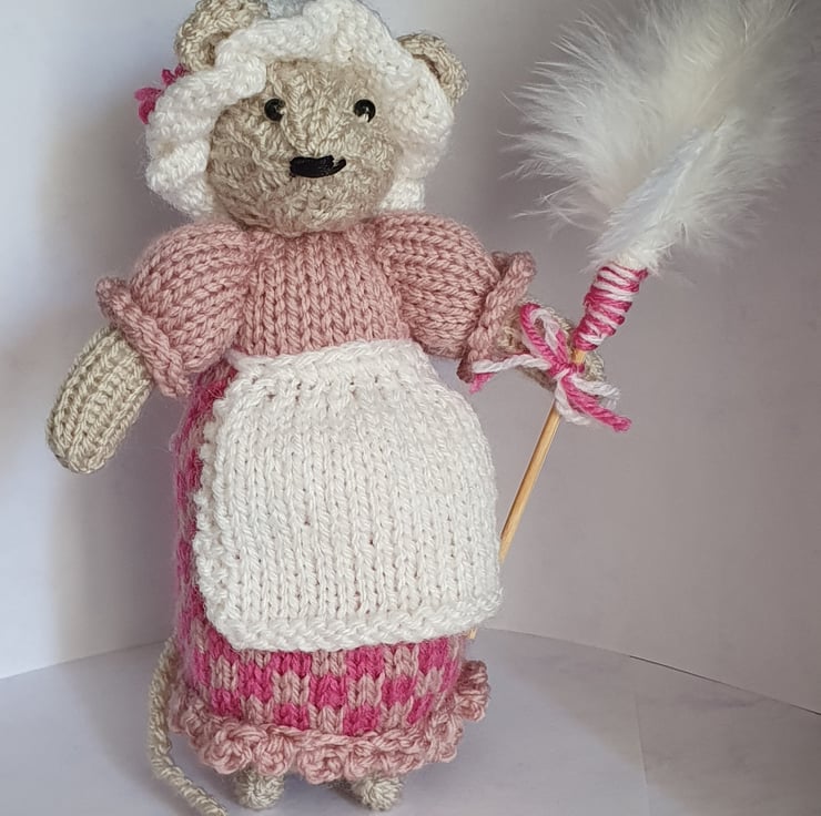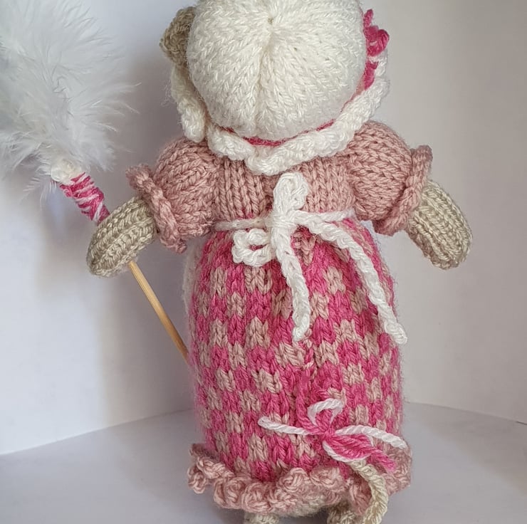 She is dressed in shades of pink, has an off white apron and mob cap and carries a feather duster.