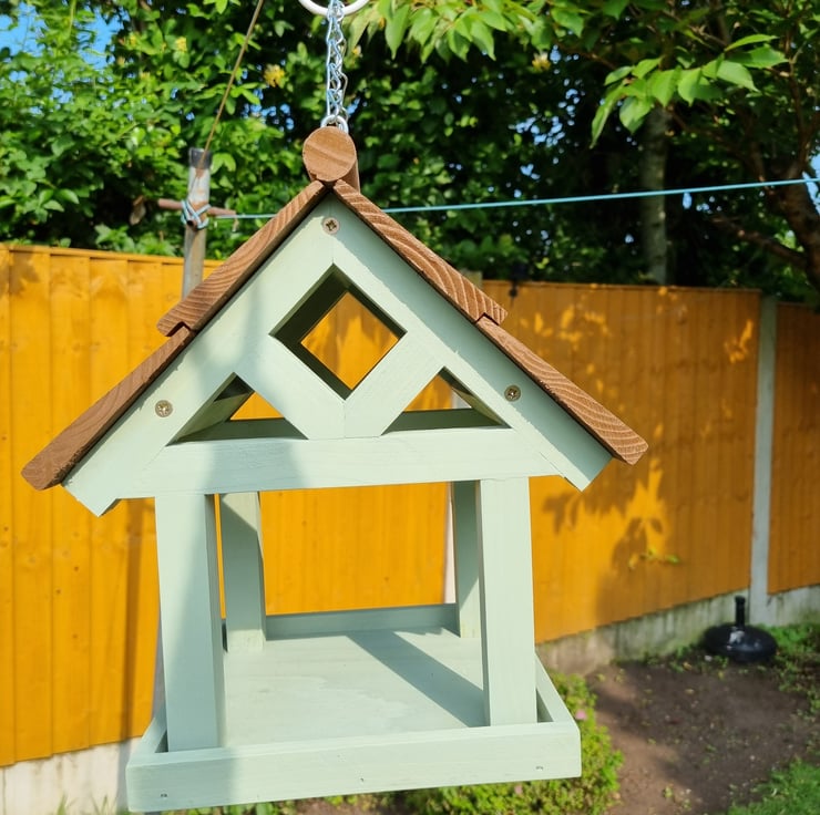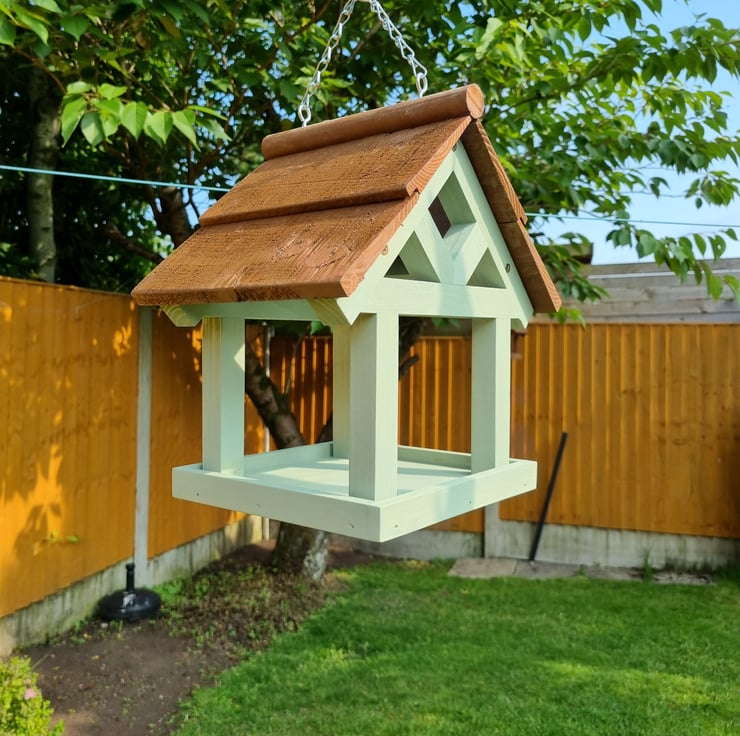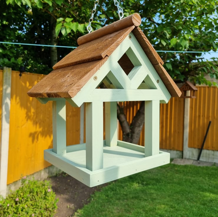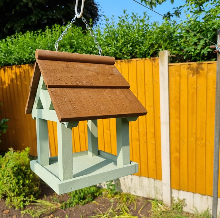 This wooden bird table is a perfect addition to your garden or patio. The hanging design allows for easy access to food, while the sturdy construction ensures it can withstand daily wear and tear. Assembly is not required for this table, which measures 30cm in height, 21 cm in depth, and 28 cm in width. Comes with a water based wood treatment ,Colour Dusted Aloe (Green) and Harvest Brown roof.The table comes with a chain for easy hanging and is suitable for a variety of garden and patio setups.