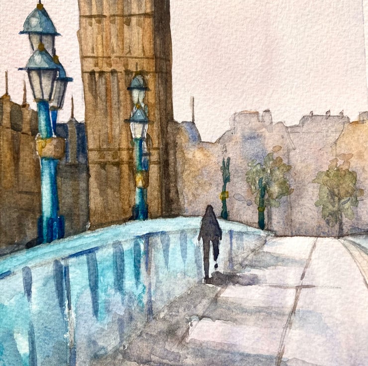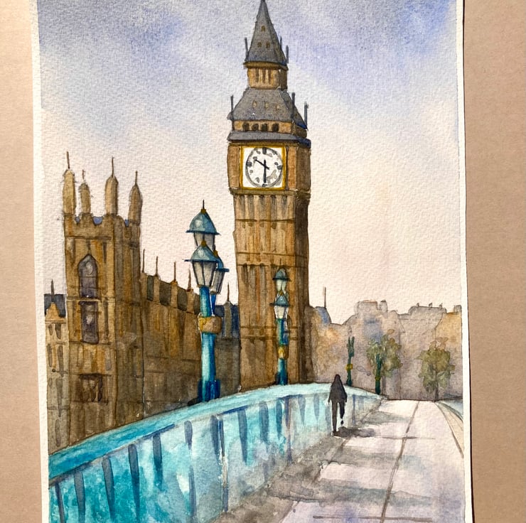 This colourful and atmospheric original watercolour of Big Ben from Westminster Bridge will enhance any wall space and brighten up your home decor. It is painted in the rich warm colours of the famous landmark, with burnt uber and burnt siennas. I love the different composition, as the photo was taken from Westminster Bridge.