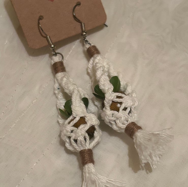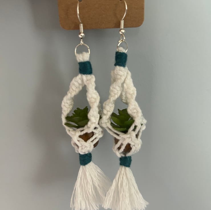 Mini macrame plant holder earrings complete with a bead pot and a fake succulent! A perfect gift the green-fingered lady in your life.