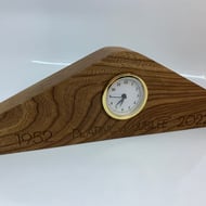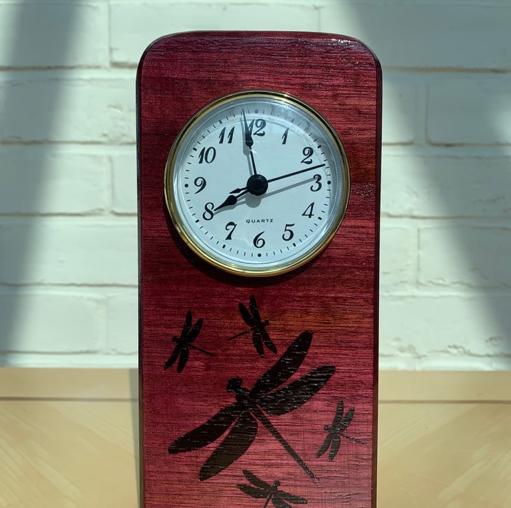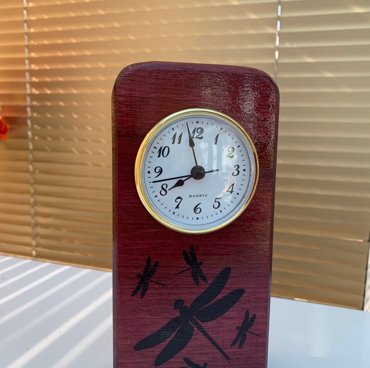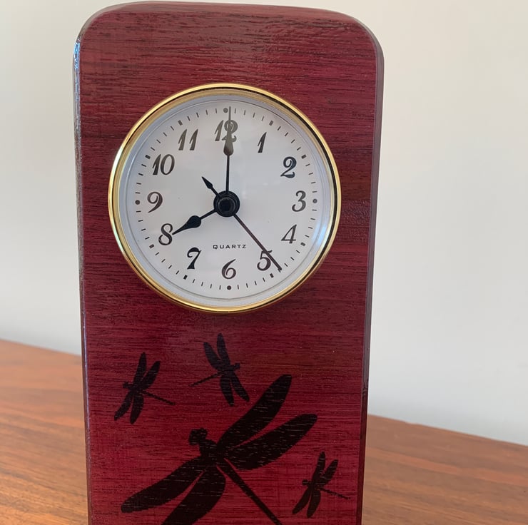 Indian rosewood clock with dragonly mofif etched in the front.