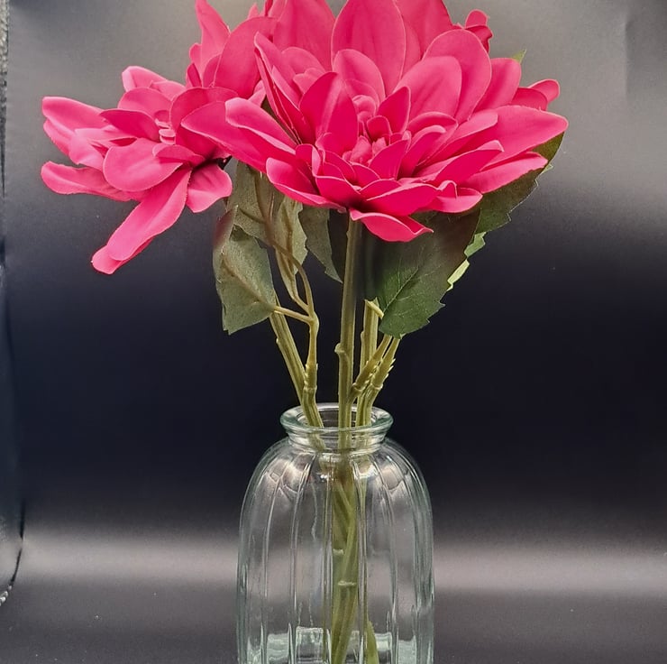 Fuchsia dahlias in glass ribbed vase .