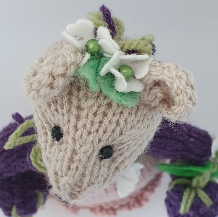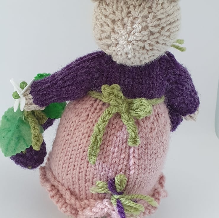 She is dressed in shades of dusky pink and purple and carries her berries and flowers.