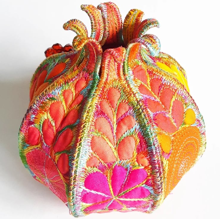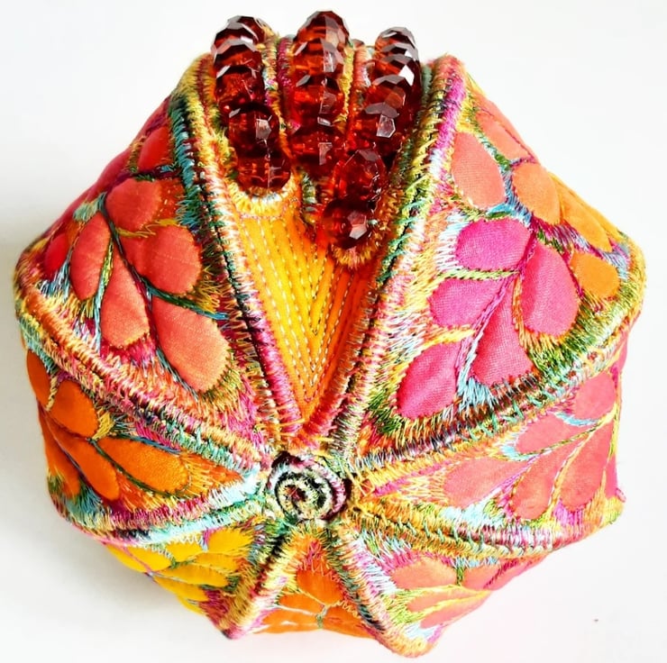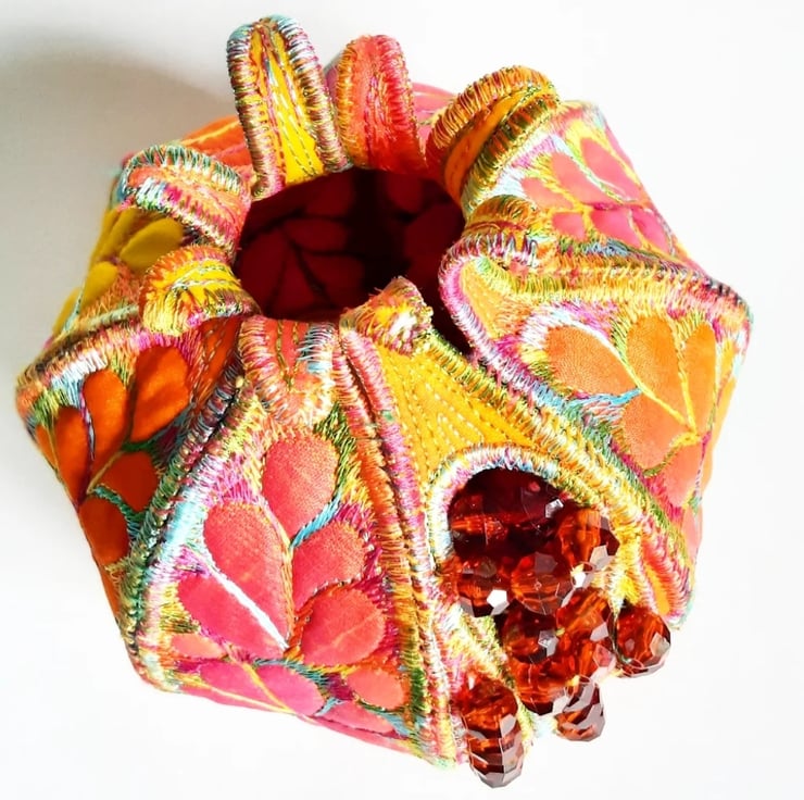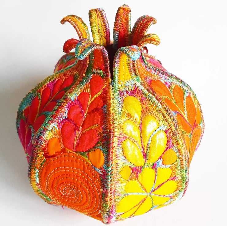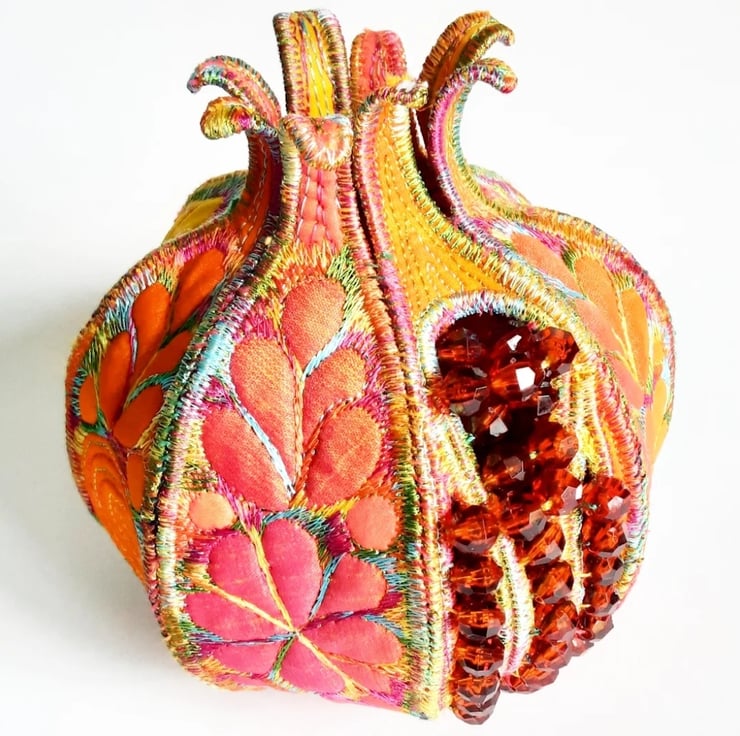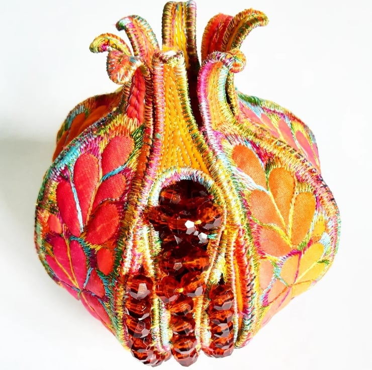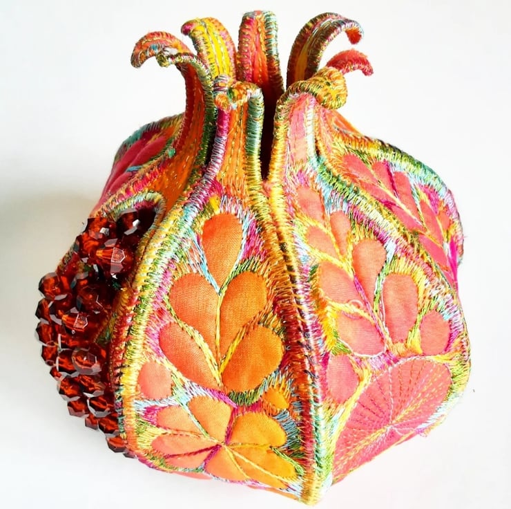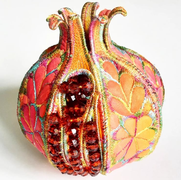 This is a handmade textile pomegranate decoration with beads to represent the seeds coming out of one of the segments.