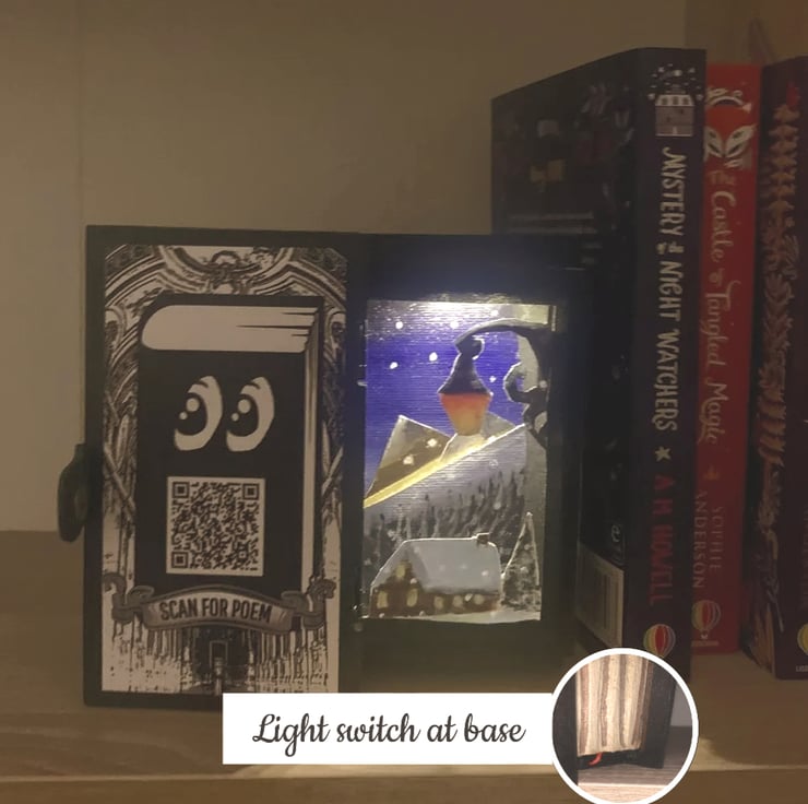 A Artsmith book is a collectabile souvenir that serves as decoration for your bookshelf . Made of pinewood, each one is carved, hand-painted and designed to resemble a book. Artsmith books have their names on the spine were they are also signed by the Artist. The cover is handpainted with a cute set of eyes attached to the front. Artsmith Books can be opened to reveal a beautiful handpainted paper diaorama. A transparent sheet covers the diorama to protect it from dust. A battery operated light is fitted on the inside of the Artsmith book with it's switch at the base. Metallic gold paper is hand cut and added to the diroama, casting a beautiful gold reflection, especailly when the light is switched on.