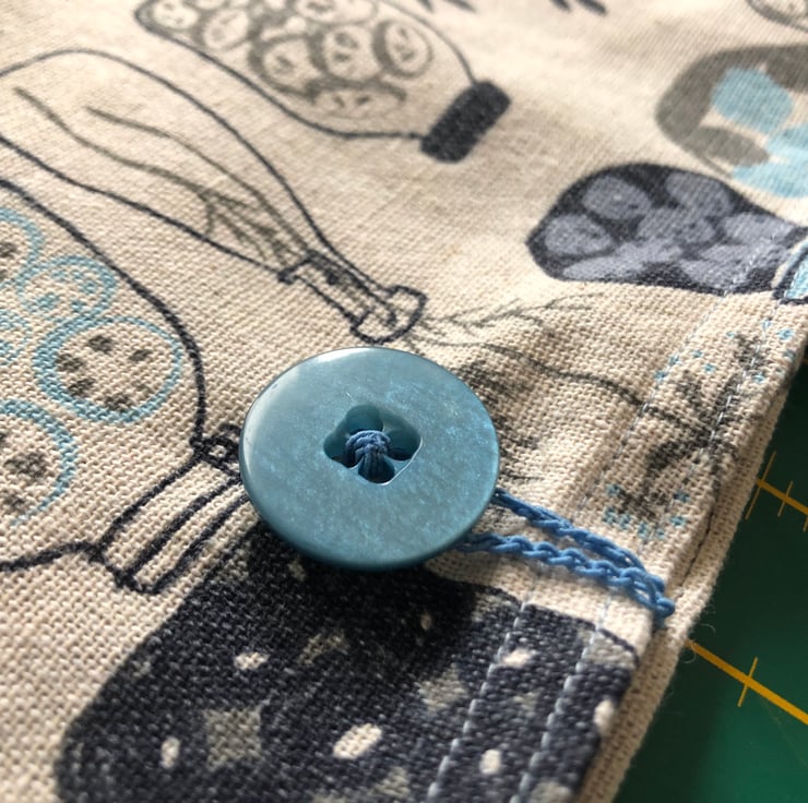 Inside is a small tag that you could clip a keyring to for your keys. It can be closed with the button fastening if wished. The button has been stitched on with elastic thread and the hoop is made from crocheted elastic thread.