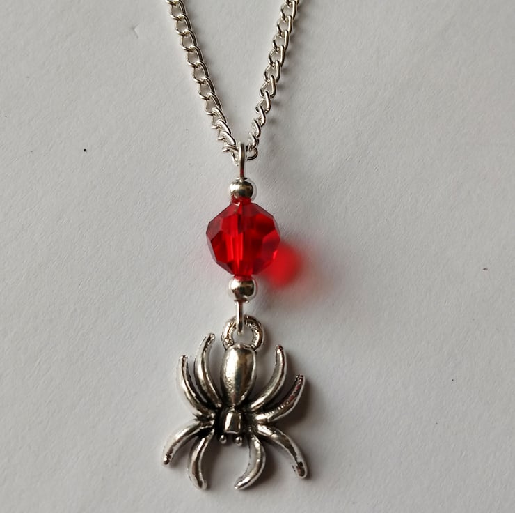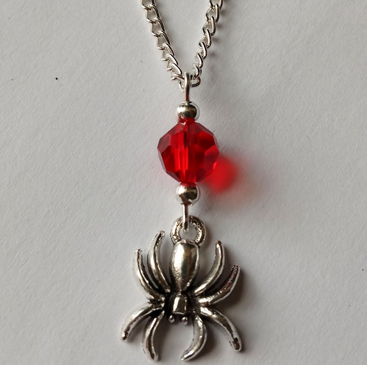 This stunning necklace has a spider hanging with red crystal on 18" silver plate chain.
