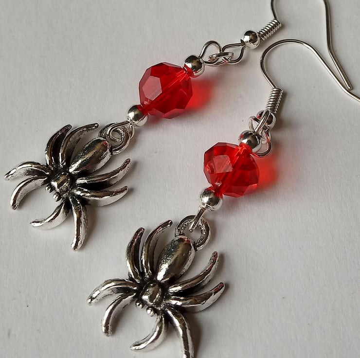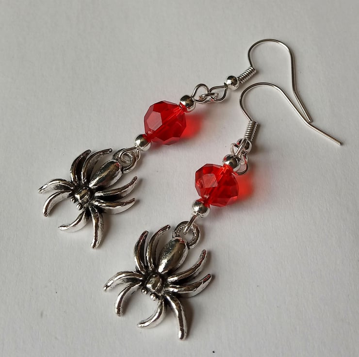 These stunning earrings have spider charms hanging with red crystals on silver plate hooks.