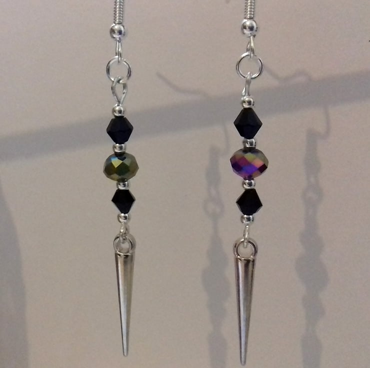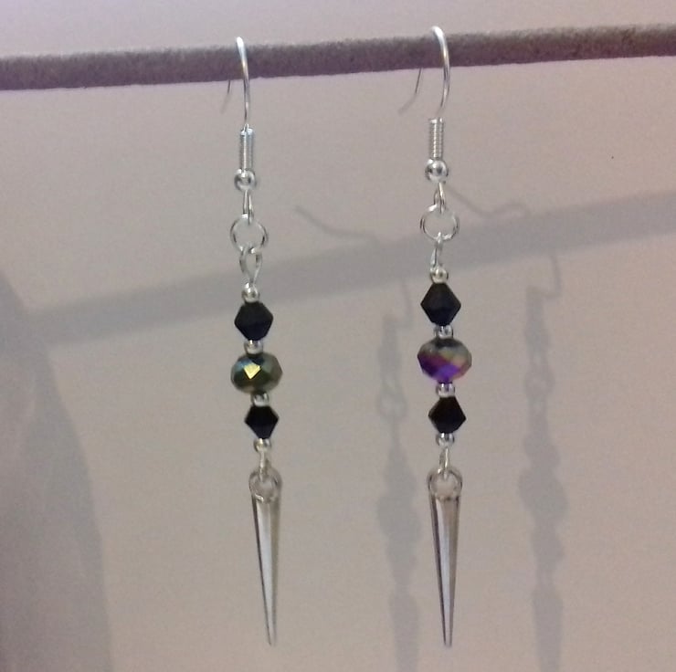 These wonderful earrings feature short shiny silver spikes hanging with black and ab crystals. They are finished with silver plate hooks.