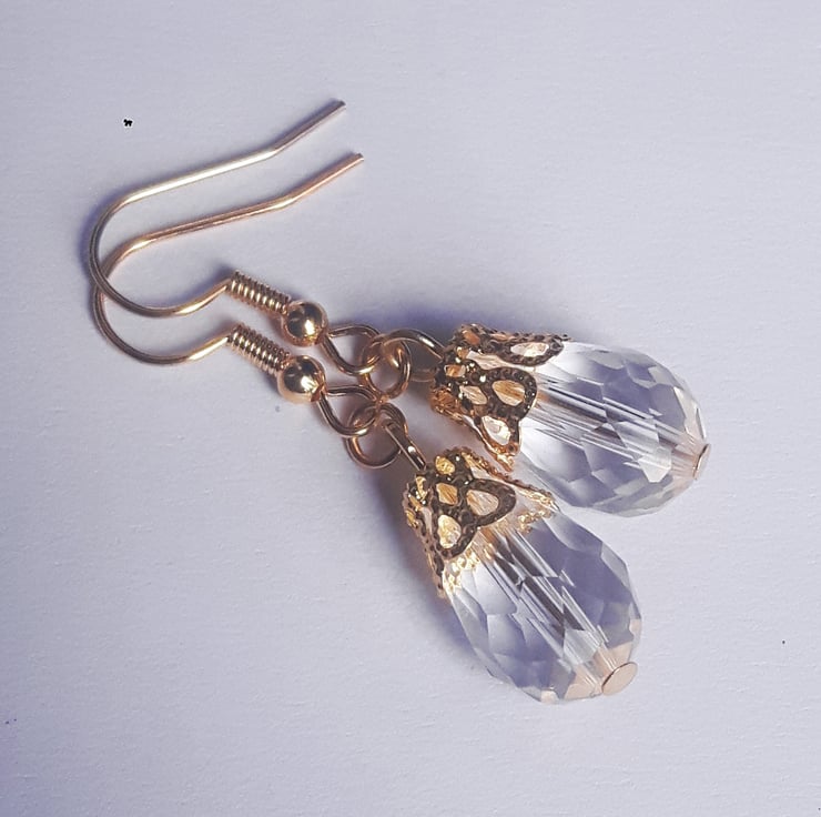 These nice earrings have sparkly crystals and added lovely filigree detail. They are finished with gold plate hooks.