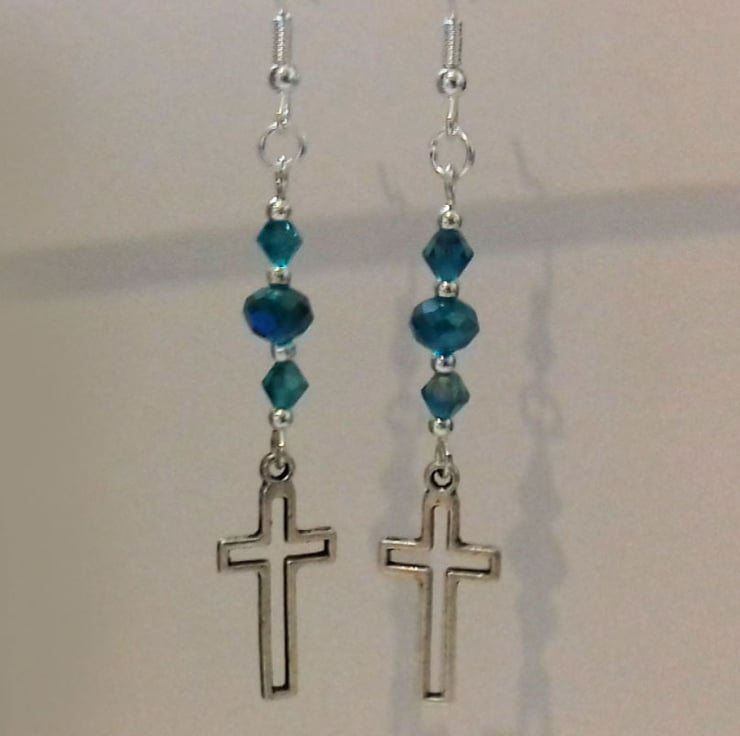 These wonderful earrings feature shiny crosses hanging with teal crystals. They are finished with silver plate hooks.