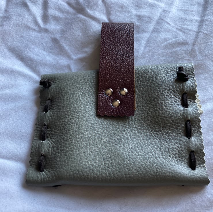 Dimensions: 5” wide, 3.5” in height. Belt loop on back will fit up to a 2" wide belt. Pouch is grey coloured leather. Belt loop is burgundy wine in colour.