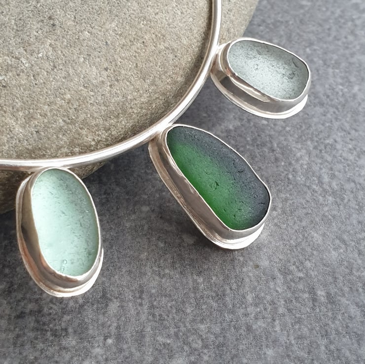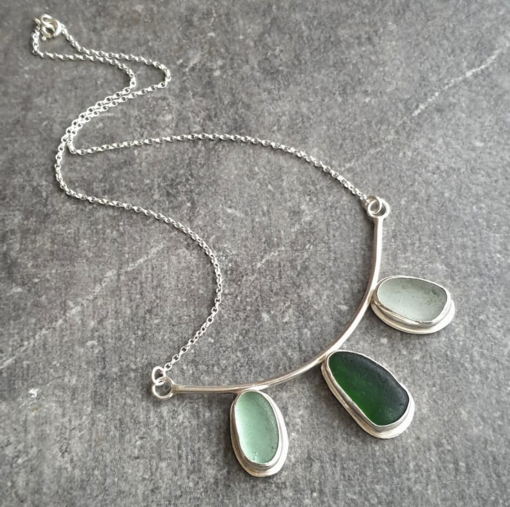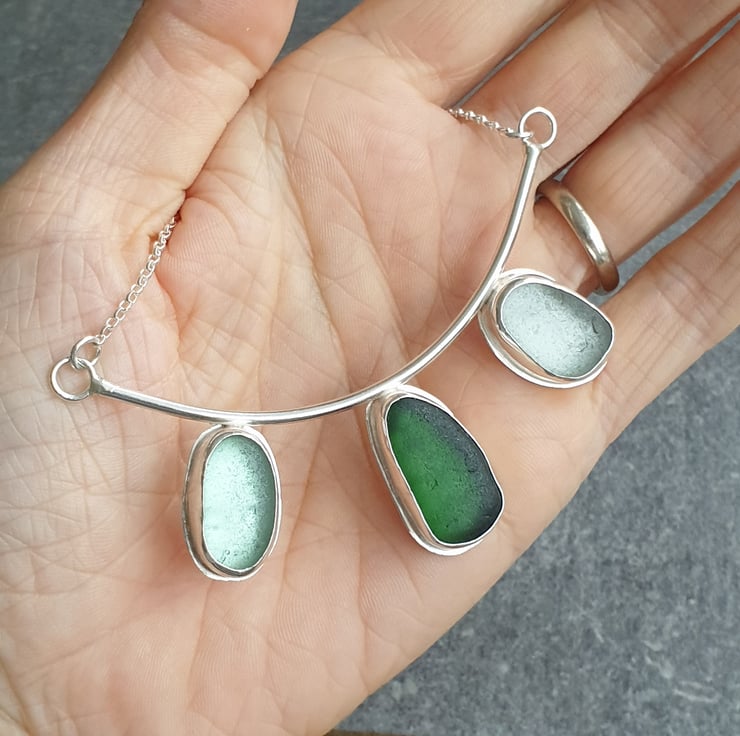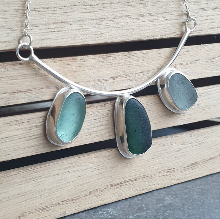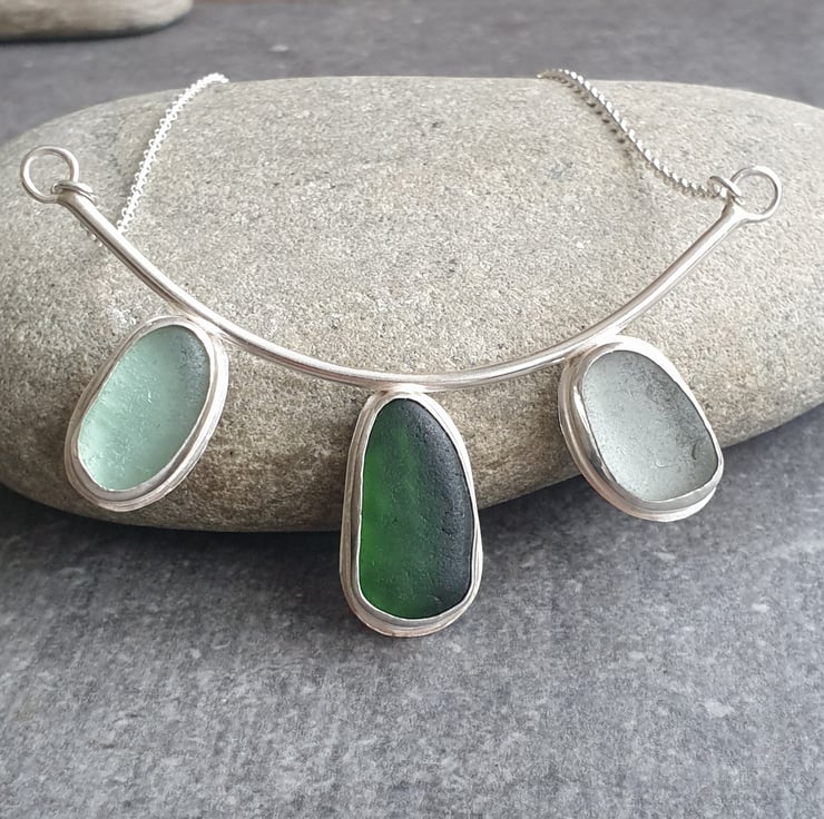 This triple green seaglass necklace is a real statement piece! It's made from three chunky nuggets of English sea glass in shades of dark green, pale aqua and frosty white, which I've bezel set in sterling silver and attached to the bottom of a curved chunky wire frame. The necklace is completed with sterling belcher chain on either side and has a highly polished finish.