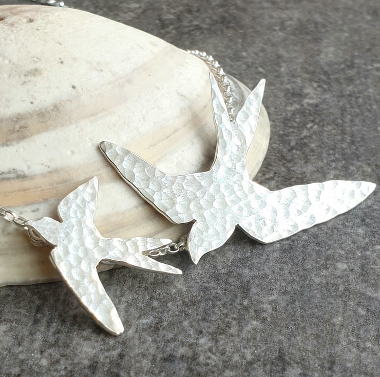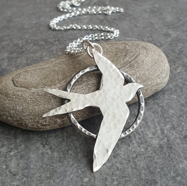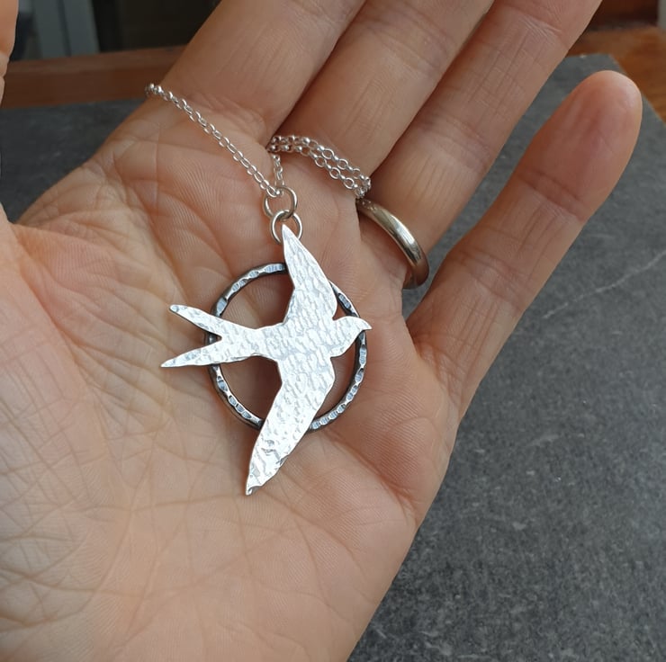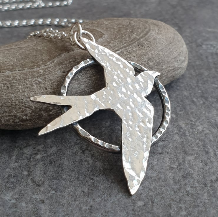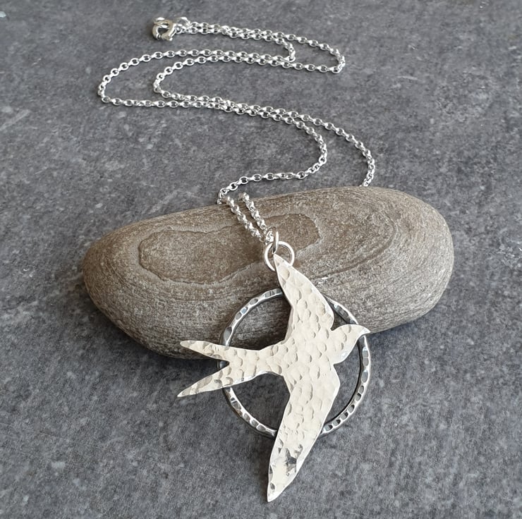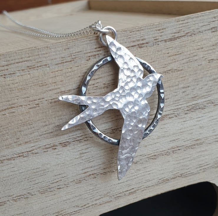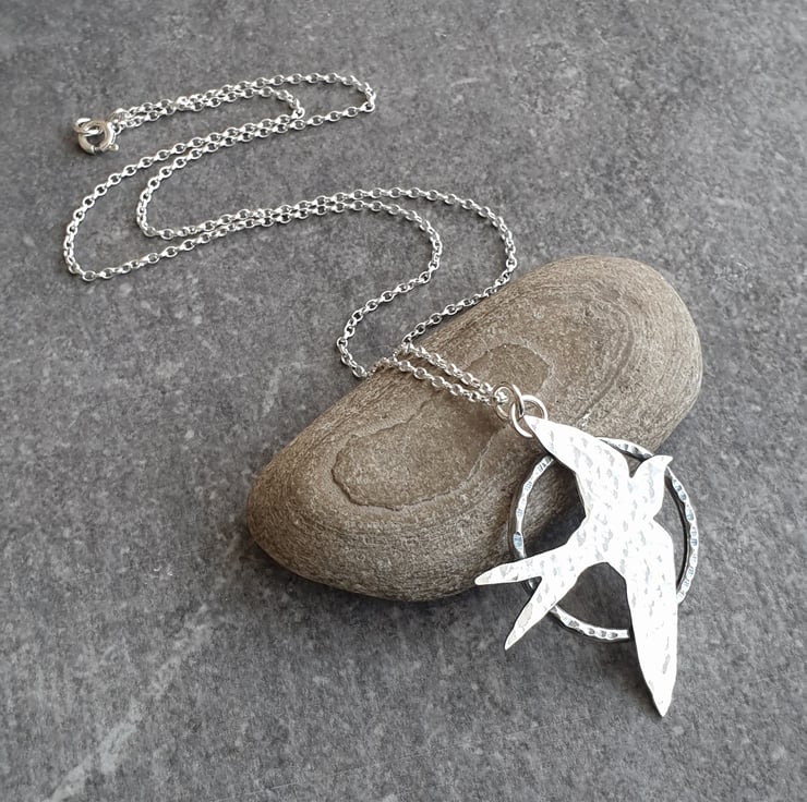 This pretty necklace features a flying swallow bird which I've hand cut from sterling silver sheet. I've given it a hammered finish and set it upon a sturdy silver hoop pendant, also with a dimple texture. The silver bird has an oxidised finish which makes it stand out from the background and adds a lovely extra detail. The pendant hangs from a sterling belcher chain and closes with a bolt ring clasp.