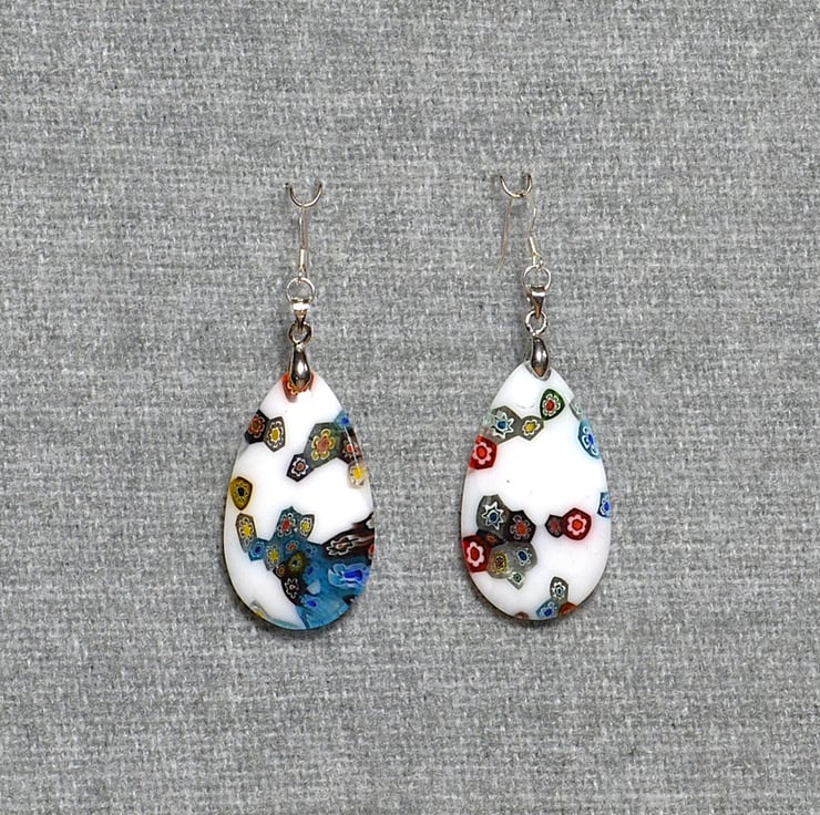 These earrings are a real statement piece. They’re quite long at 5.5cm, or 2 1/4 inches, and glass, so they have a little weight to them. The white parts of the glass drops are opaque, but the light shines beautifully through the coloured flower patterns. The drops are not identical. The pattern on each one is unique. The drops are attached to silver-plated ear wires.