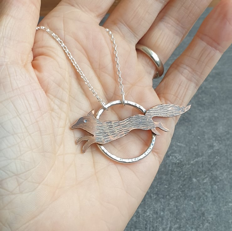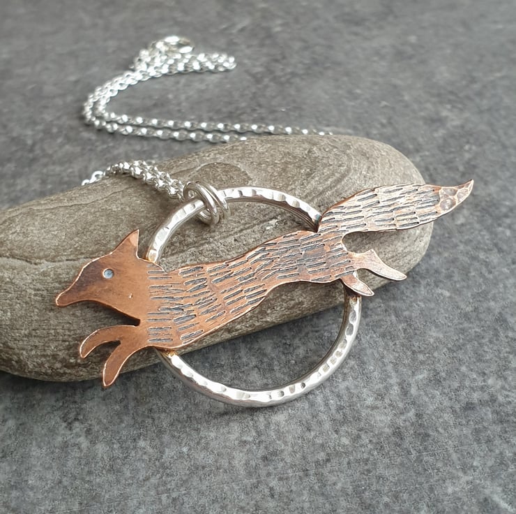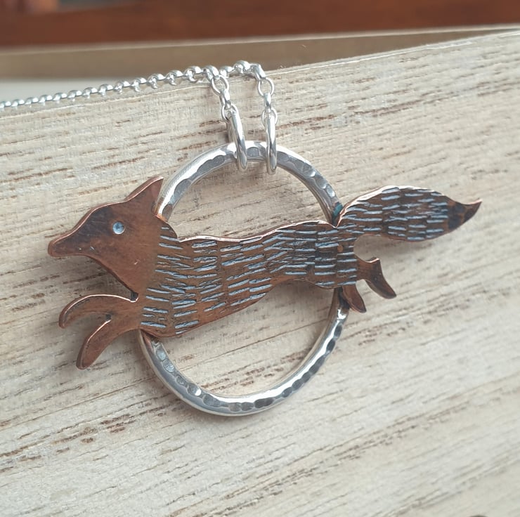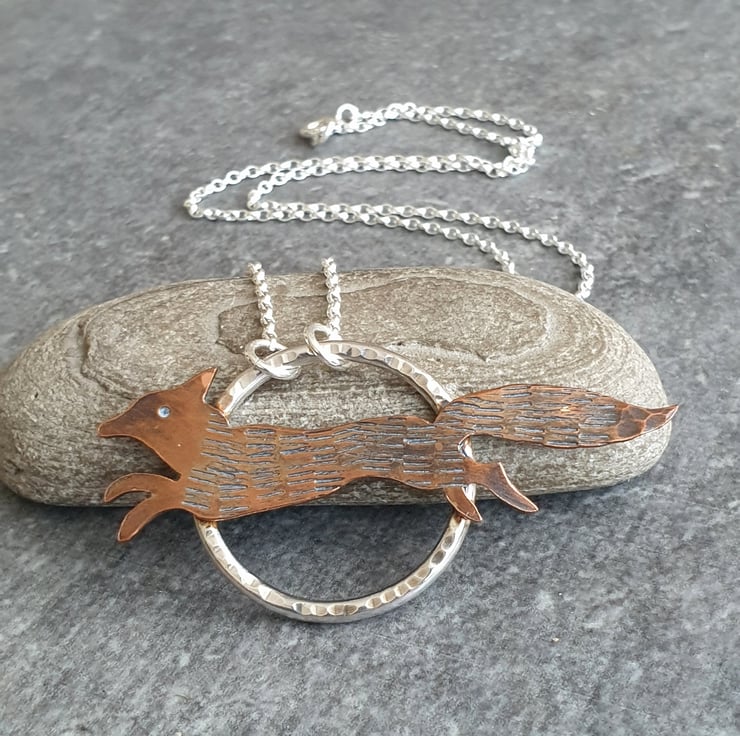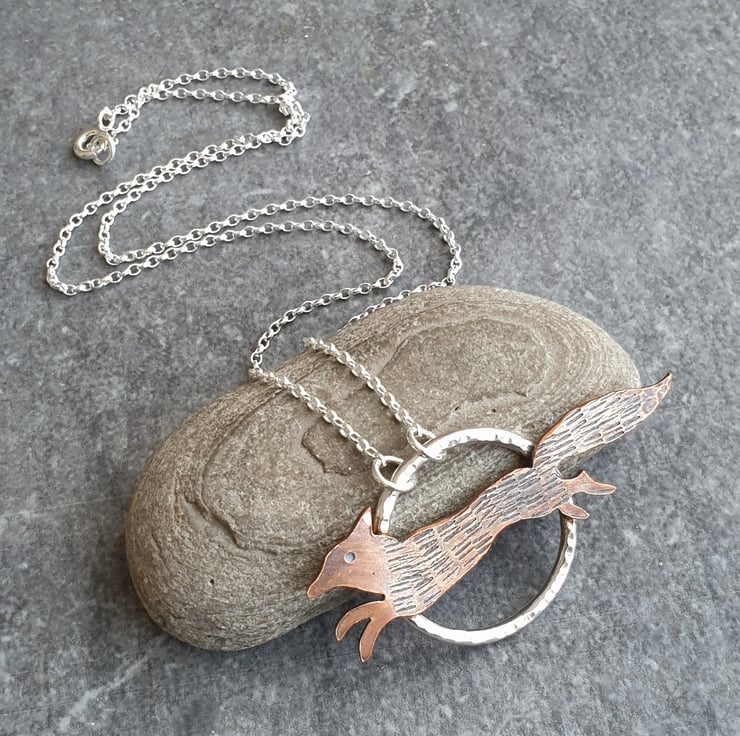 This sweet necklace features a running fox, hand cut from solid copper sheet. I've textured the fox to resemble a real fox's coat and oxidised it to bring out the detail. The fox is mounted on a sturdy sterling silver hoop pendant which has a hammered texture and a shiny finish. The pendant is completed with a sterling belcher chain and bolt ring clasp.