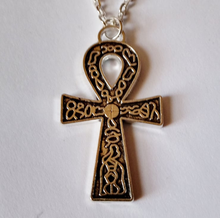 This stunning necklace features a large chunky ankh pendant hanging on 26" silver plate chain.