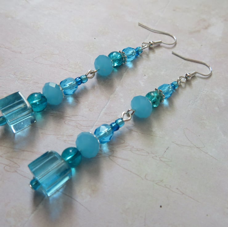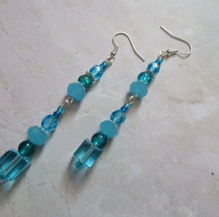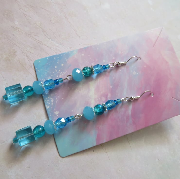 Pretty Turquoise and Aqua Blue Crystal Beaded Long Drop Dangly Earrings