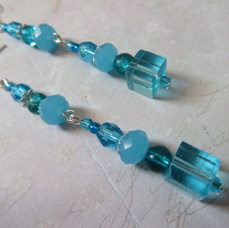 Each earring is adorned with an artful mix of turquoise and teal glass crystals, silver flower bead caps, aqua rondelle opaque crystals, tiny seed beads and featuring a light turquoise cube bead. that all blend together to shimmer and catch the light beautifully.