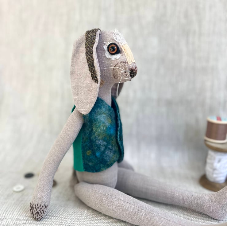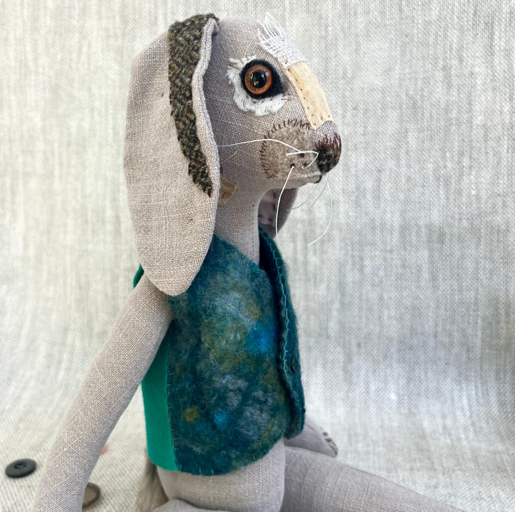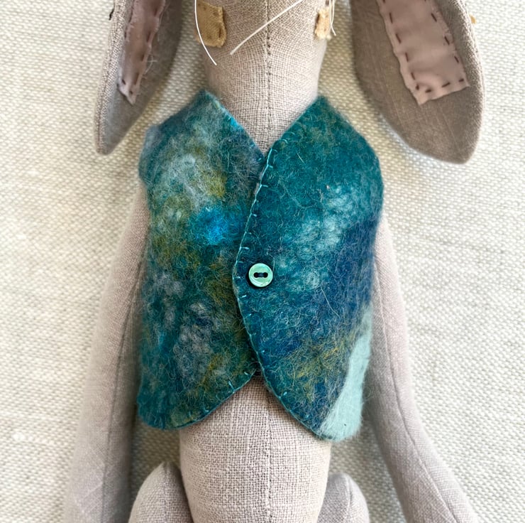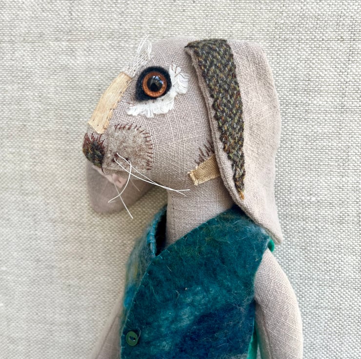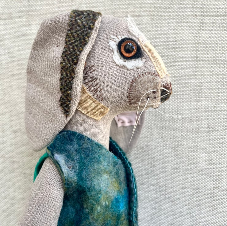 Bennie the Rabbit is a handcrafted textile heirloom doll.