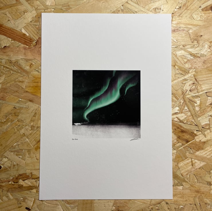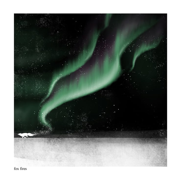 An illustration depicting the northern lights inspired by Finnish folklore. According to legend, Tulikettu, the firefox, would run so fast that it’s tail would whip up sparks creating the aurora.