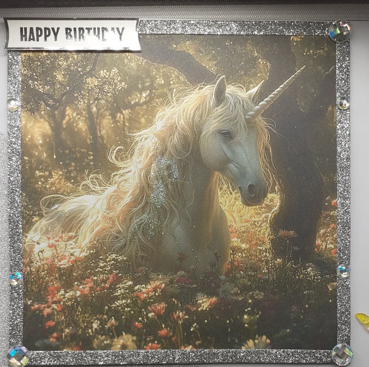 An image of a white unicorn in a sunlit woody glade. His mane has been glittered for a magical effect. A "Happy Birthday" banner, mini iridescent butterflies, a big pink mesh butterfly, a big peach/orange silk flower a creamy yellow silk flower with multi green silk leaves.