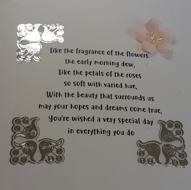 There is a holographic silver 16 & a birthday verse in silver finish the design.