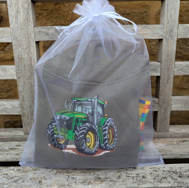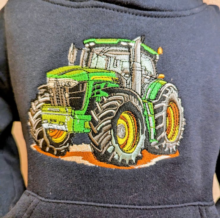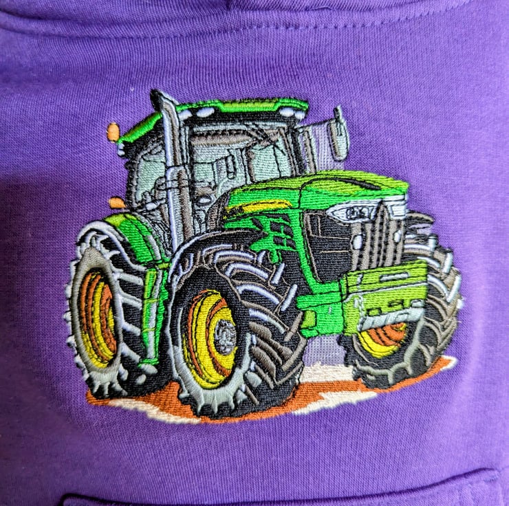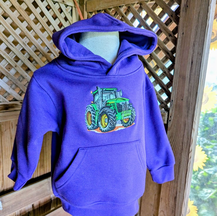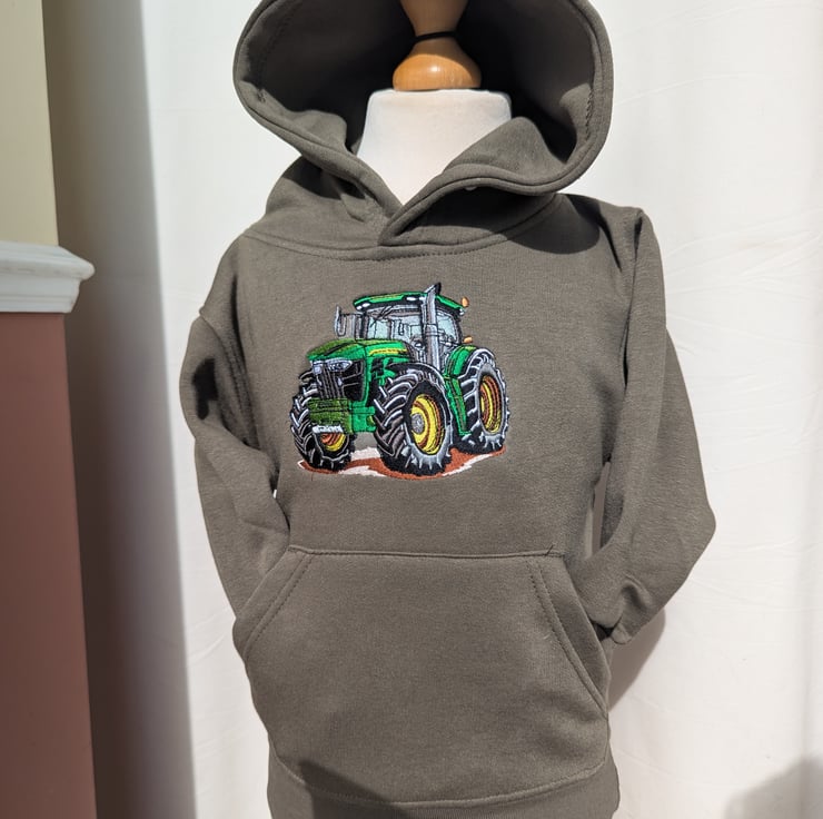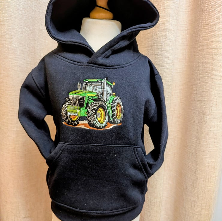 Hooded sweat shirt with front pocket, embellished with an embroidered detailed green tractor on the front. This would make an idea gift.