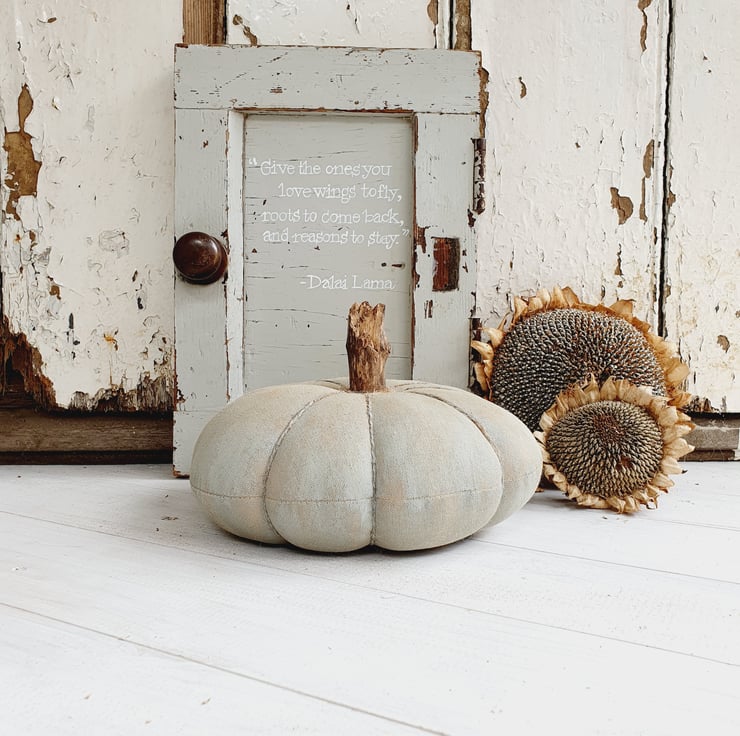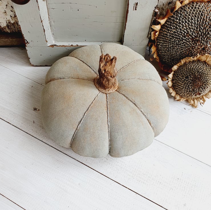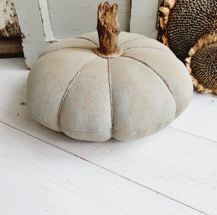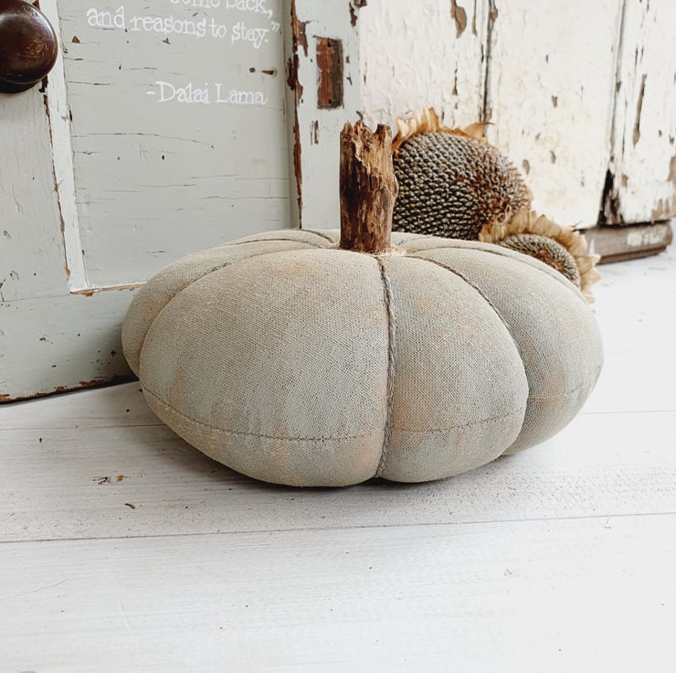 This is a medium sized heirloom style pumpkin made in the American Primitive Style. It would look great in your home for the Autumn and Halloween and can be used year after year. The fabric has been stained with walnut granules. It has then been painted and sanded down to give it an aged appearance. The stalk has been made from a large twig and I have then dusted it down with cinnamon to finish.