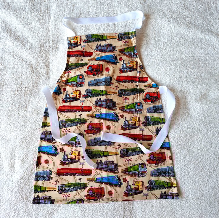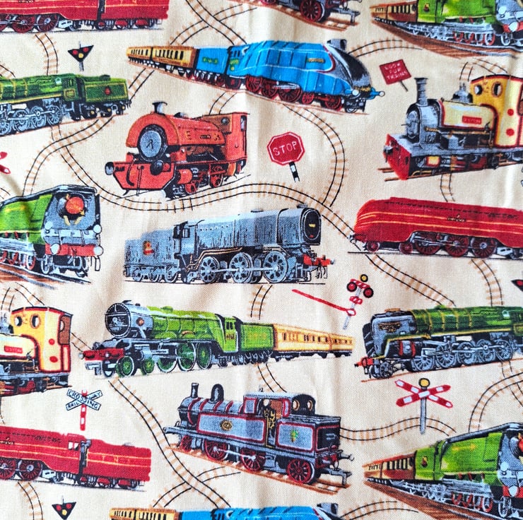 This is a lovely tan child's pinny with realistic steam engines scattered over it, against a background of railway tracks and signs. (The engines may not appear in the same positions as in the illustration.) I have made it of a good quality machine washable cotton, with acrylic webbing straps. It measures approximately 22" (56 cm.)from neck to hem, and 17" (43 cm.) at the widest point, and will fit a child from about 6-10 years.
