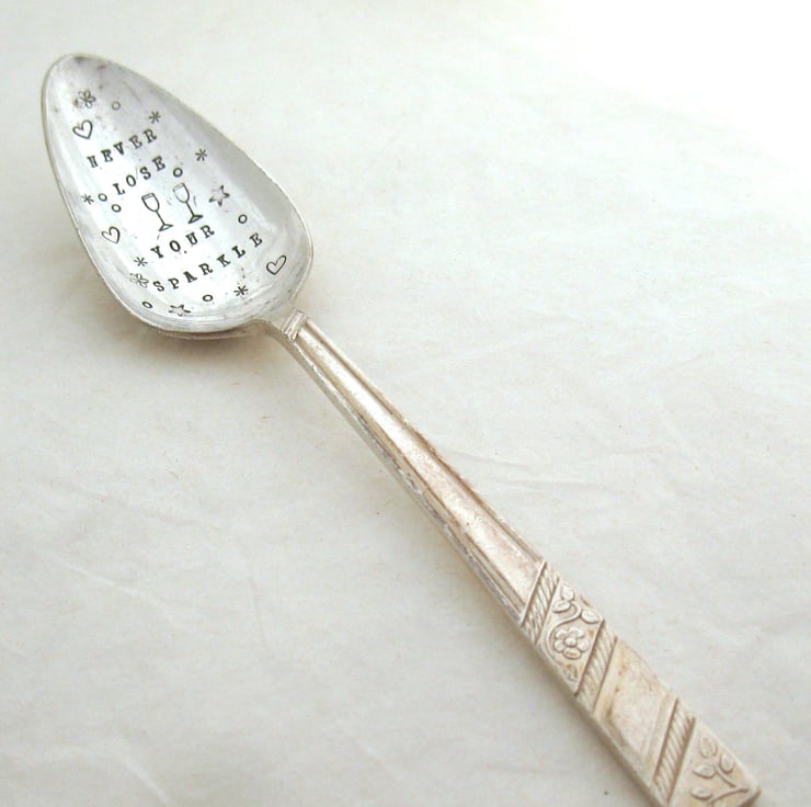 An upcycled hand stamped vintage silverplated spoon to put in the neck of your fizzy wine bottle - apparently this keeps the bubbles bubbly for longer although I've never had leftovers for long enough to do a proper test! I've hand stamped 'NEVER LOSE YOUR SPARKLE' in black lettering in the bowl along with a pair of wineglasses and assorted bubbles, stars and hearts. It's a pointy grapefruit spoon measuring approximately 5 1/2" (14cm) long and has a nice little floral and rope twist detail on the handle.