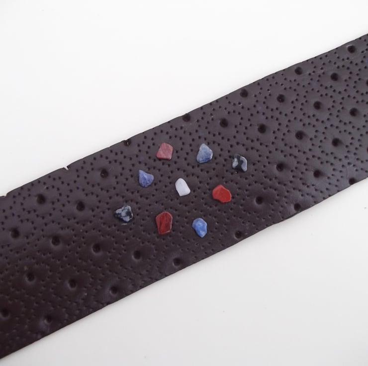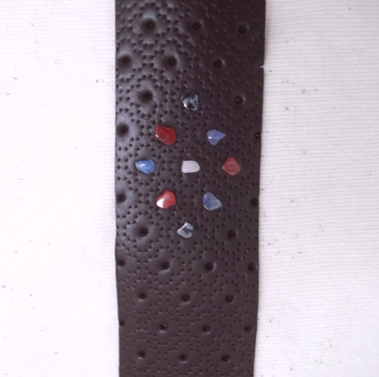 I had this loverly floral embossed dark brown leather and was making lots of different things. I thought it would make great book marks but wanted to zhuzh it up. I had these crystal stone chips that I use in my jewellery making so going through the hundreds of shapes, colours and sizes I picked out ones that weren't too big or small and wouldn't stick out too much and put them into groups of colours to add to these bookmarks.