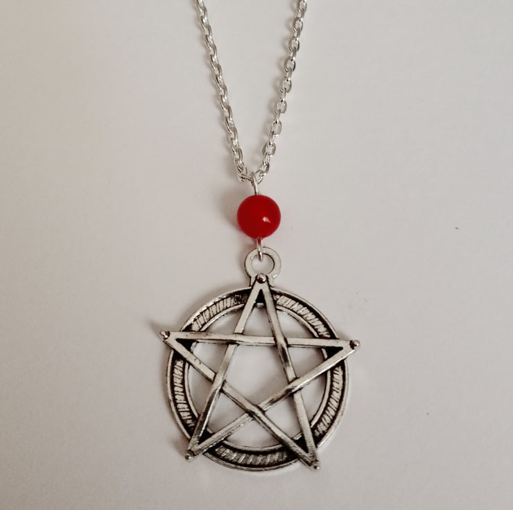 This great necklace has a pentagram hanging with red gemstone beads on 18" silver plate chain.