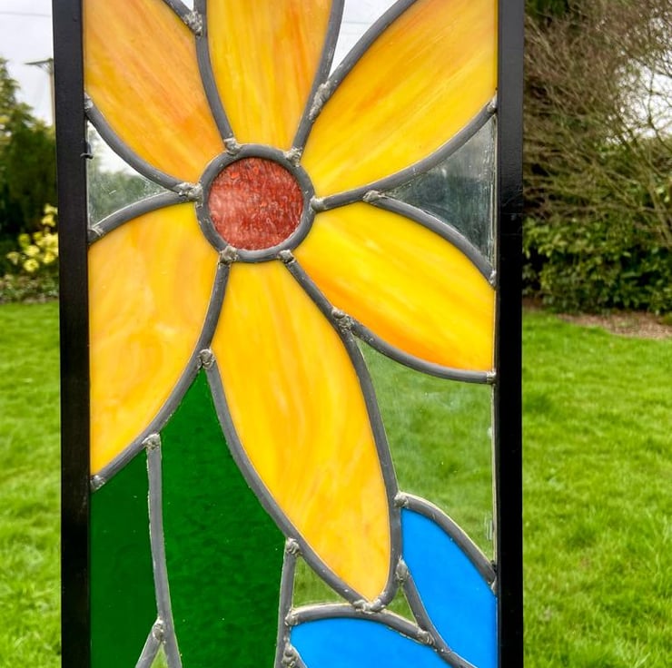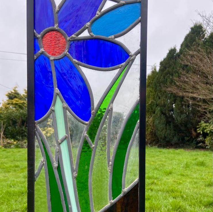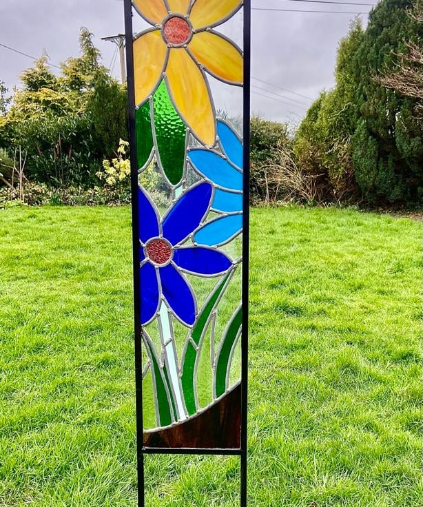 Made in traditional leaded stained glass, with a painted mild steel frame deigned to be pushedinto the soil. The frame is angled mild steel with another rectangle inside to hold the glass. This is designed so the glass panel can be changed if wanted. The whole structure is robust. Ours has withstood gales and playing dogs for 4 years without and harm.