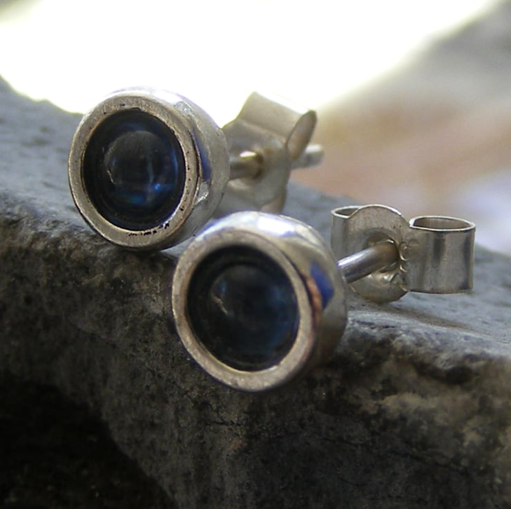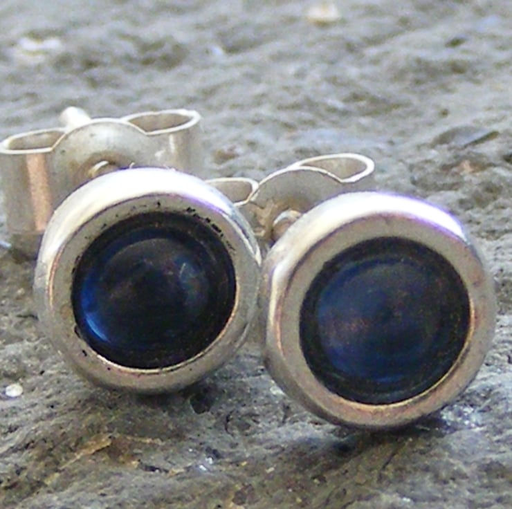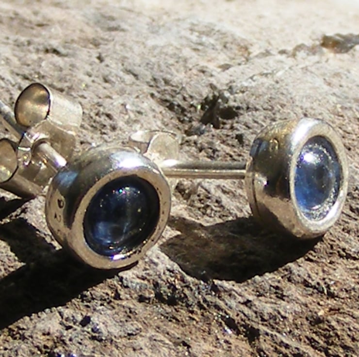 Iolite is the most beautiful inky blue/violet gemstone. I have set polished round cabochon cut iolite stones into handmade setrling silver bezel set studs.