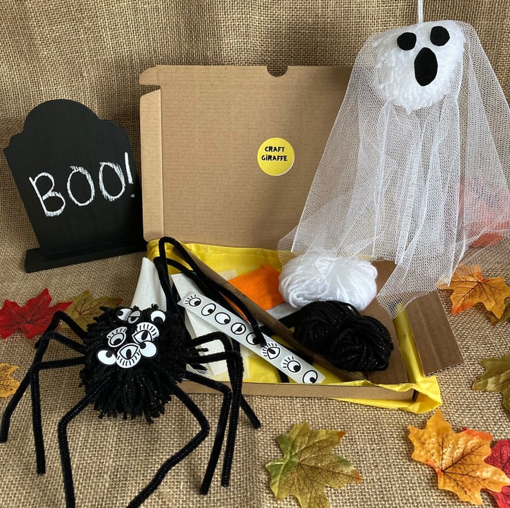 Eco friendly Halloween Pompom Creatures Craft Kit - with everything you need to create a spooky ghost & spider! Halloween Crafting fun for all ages.