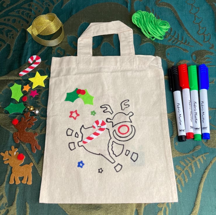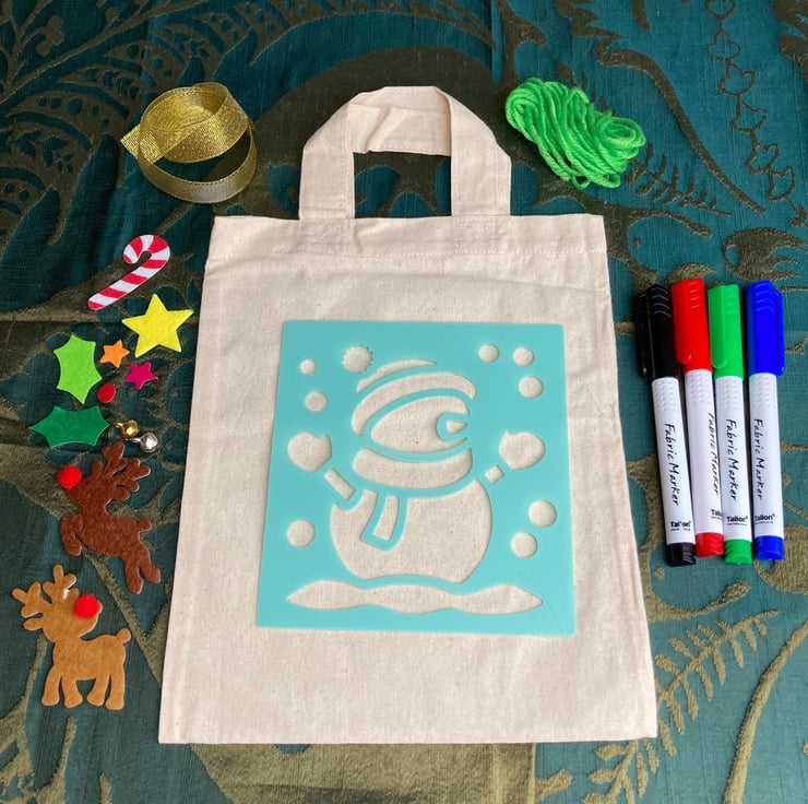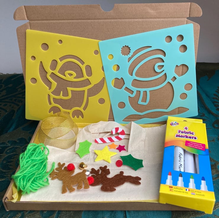 Kit includes: plain cotton bag, 4 x fabric pens, 2 x Christmas theme stencils, red or green wool, selection of felt stickers, ribbon and mini bells.