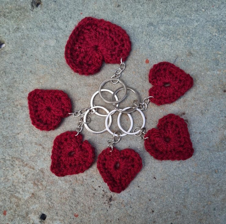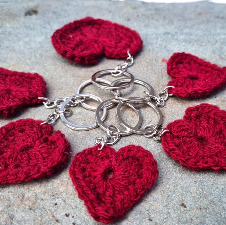 These little heart keyrings are crocheted using red yarns saved from landfill. Perfect for a little valentines gift or as a cute bag charm or keyring addition!