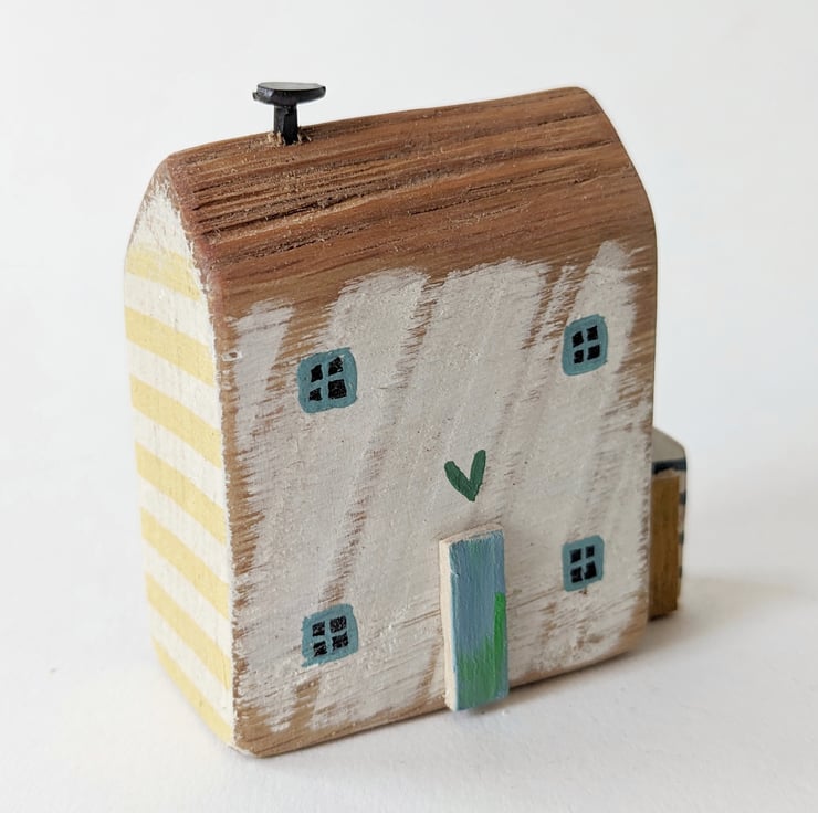 This little wooden house has been hand carved and painted and each piece is one of a kind.