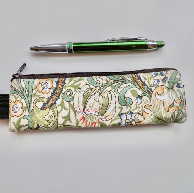 This one is made with a medium weight cotton fabric printed with William Morris' iconic Golden Lily design in red and green. I backed this fabric with fusible quilter's wadding and then machine stitched down each side with three rows of wave stitch to achieve a lightly quilted effect. The cotton lining is coffee colour with small spots.