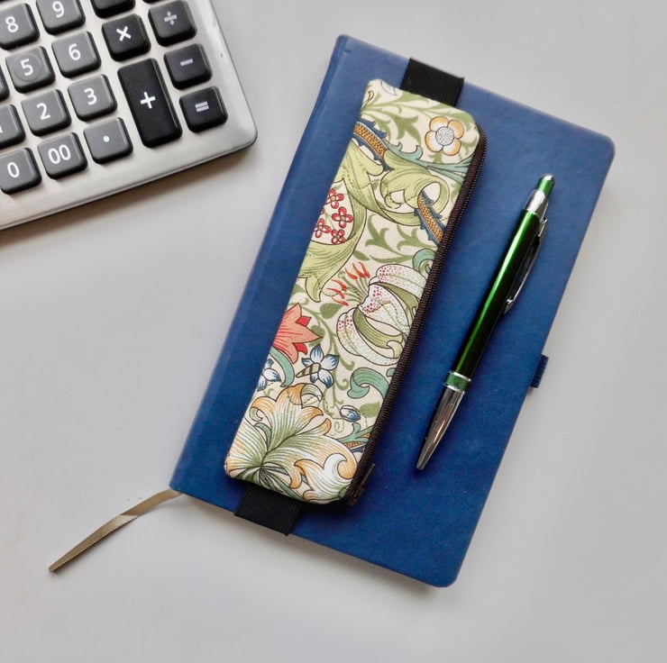 A mini pencil case designed to be kept on the front cover of your diary or journal, held in place with an elastic strap. Just slip it on the front cover and you can always have a pen and pencil to hand. Add it to whichever notebook you are using for the day.