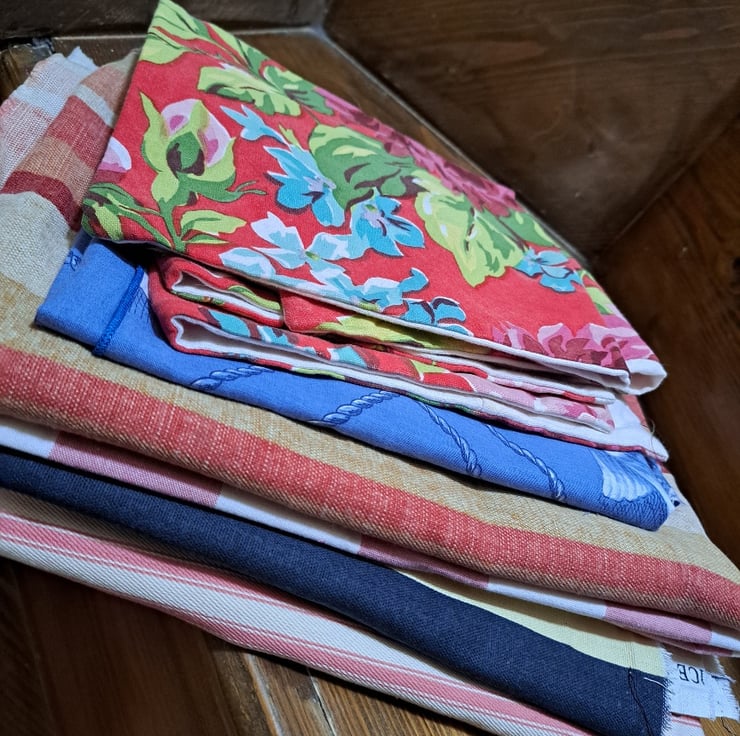 So you've got an Airbnb and you need some new soft furnishings... this is the bundle for you. Five assorted pieces of vintage and rescued furnishing fabric with two actual cushion covers thrown in. One piece has a small hole but I quite like the look of wear and tear on old fabrics, so shoot me. Others have the odd small mark (see last observation.) The two pillow cases are both bright and a bit faded and so full of charm.