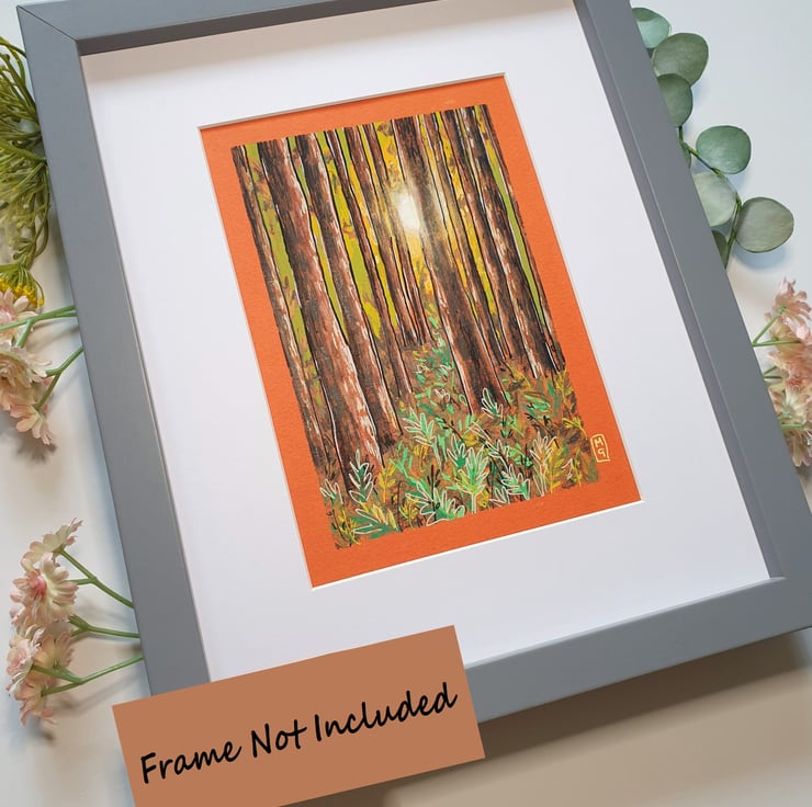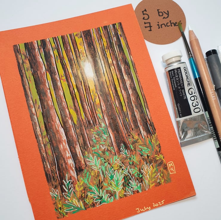 A small landscape artwork of a lush dense forest with quite densely packed trees and ferns growing on the ground. The sun is peeking through the trunks. The artwork is on orange paper.