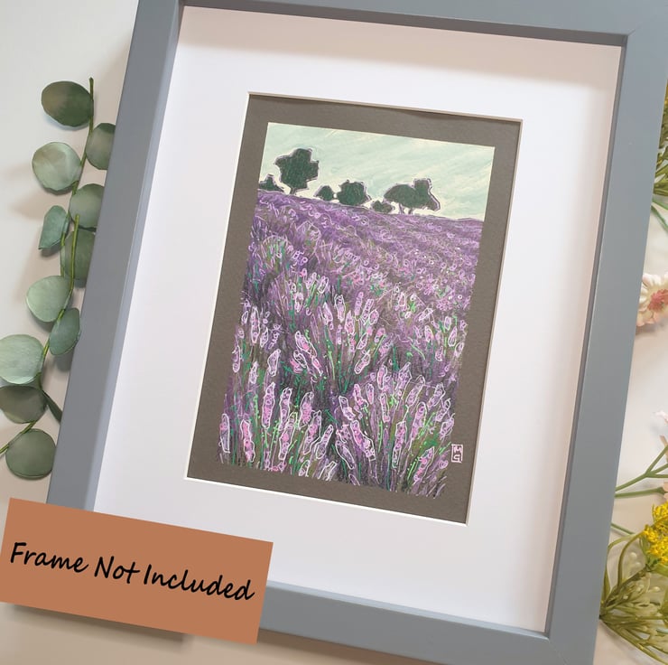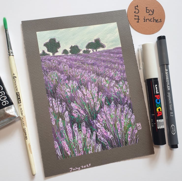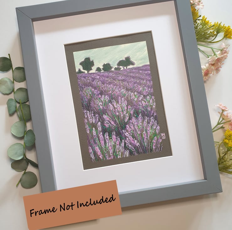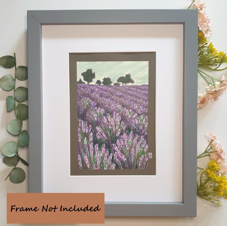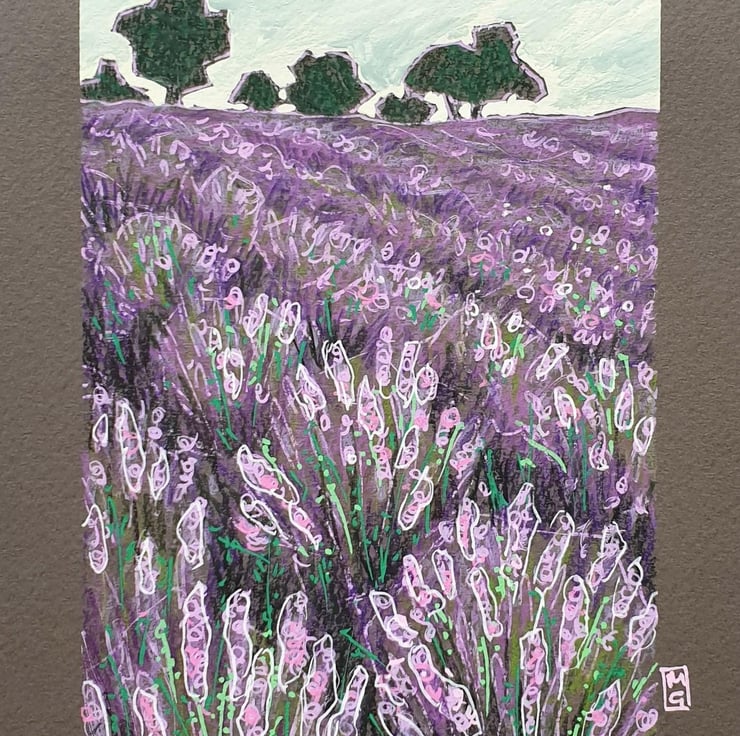 A small landscape artwork of a field of lavender. Rows of purple flower shrubs with trees in the background and a grey green sky. The artwork is on grey paper.