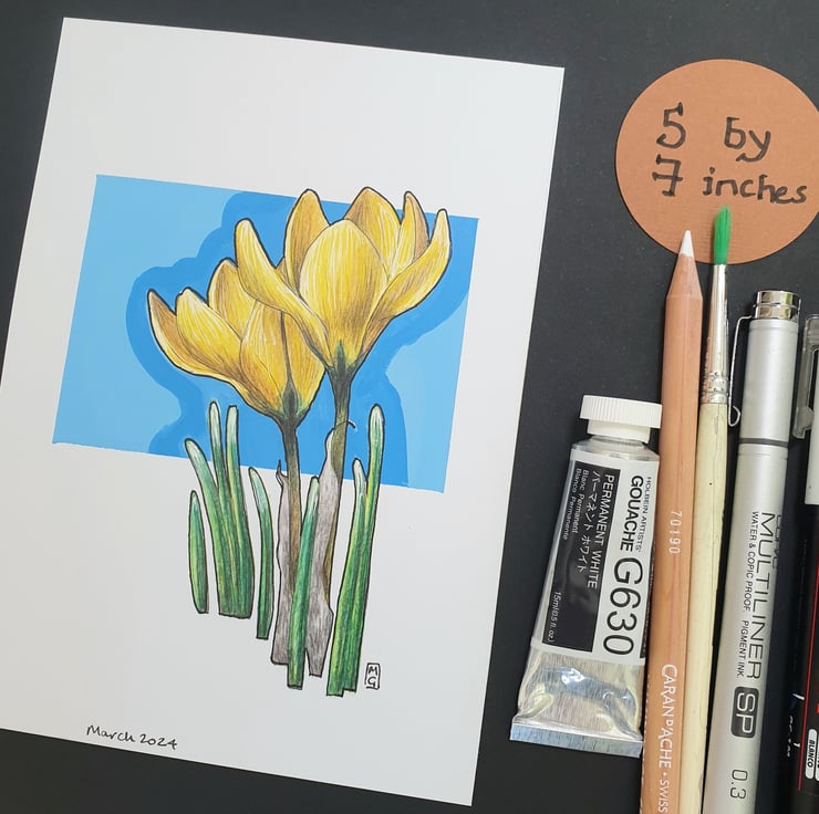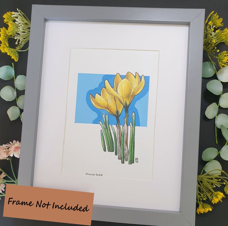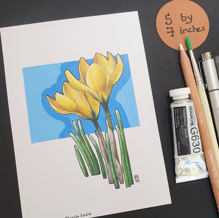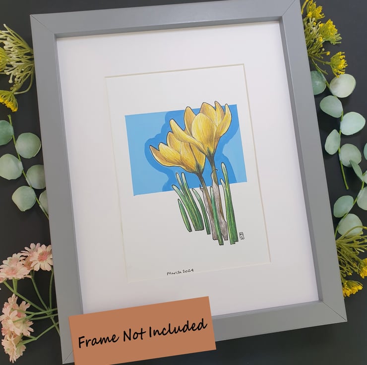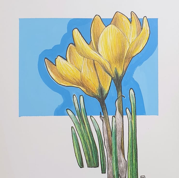 A colour drawing of yellow crocus flowers on white paper with a bright blue background. Crocus are among the very first flowers to bloom each spring. In cold climates they will often open when there's still snow on the ground. The Crocus symbolises cheerfulness, gladness, mirthfulness and youth.