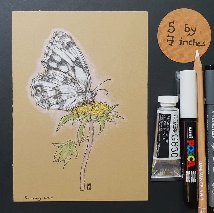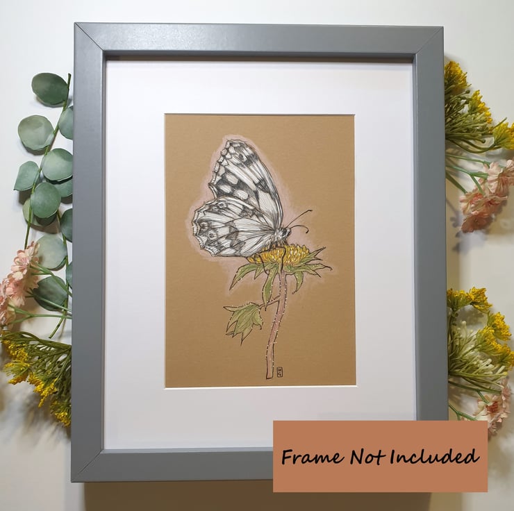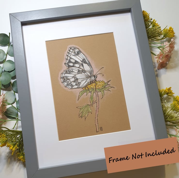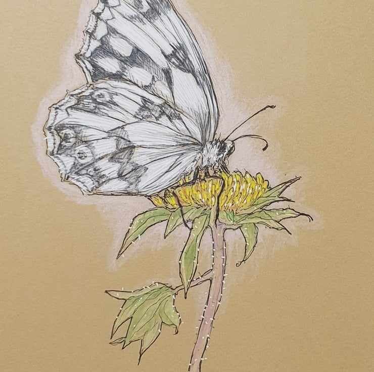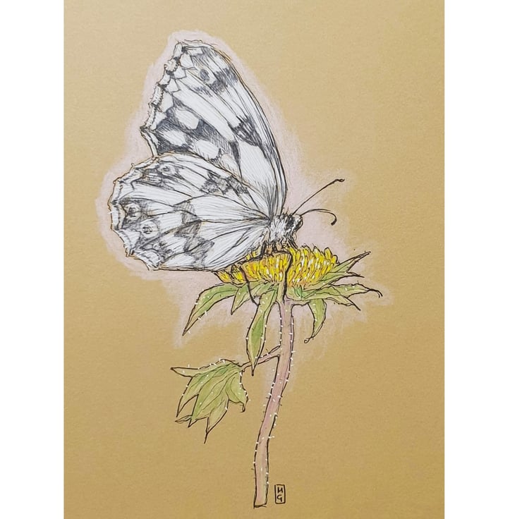 A drawing of a Marbled White Butterfly with white and black markings sitting on a yellow flower bud. This species is generally only found in the countryside, rarely in gardens.
