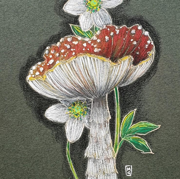 A colour drawing of a red and white Fly Agaric Mushroom with Wood Anemone, a little white wildflower. This drawing is in a cute illustrative style.