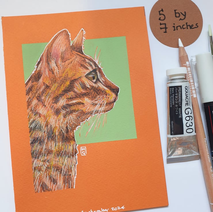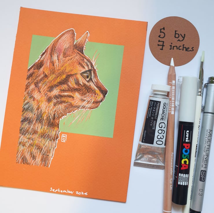 A colour drawing of the profile of a little orange tabby cat on orange paper with a green background.